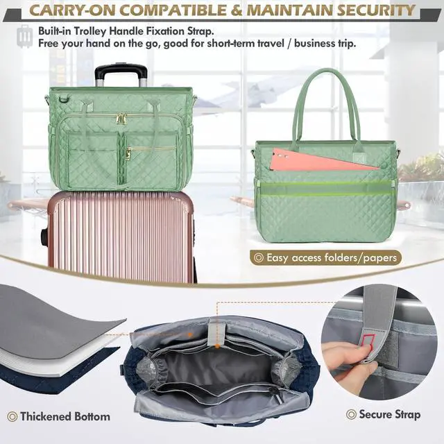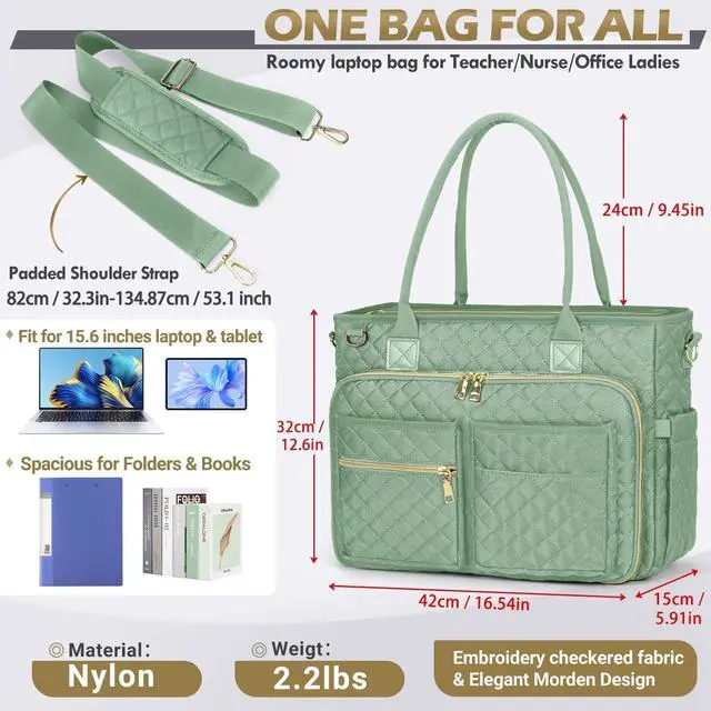 W x 12.6"H; weight: 2.2 lbs. Double layers of the front organized compartment aim to store scattered items. The front zip compartment features 4 elastic loops, one open pocket, and one mesh pocket, it's easy to stay organized with all of the different pockets. The 3 open pockets and a zip pocket in front offer easy access for items on hand. It also features a paper pocket in the back ^^ LONG LASTING MATERIALS- Made of durable water & scratch resistant polyester fabric, with smooth golden zippers, sturdy handle, and adjustable padded shoulder straps, nurse work bag prefect combination of stylish and functional. Reinforced stitching at each stress point ensures the laptop briefcase durability for long-term performance. High quality quilted teacher laptop tote bag aims to provide a sturdy and reliant user experience ^^ CONVENIENCE DESIGN FOR TRAVELERS- The luggage strap in the back allows this women tote bag to slide over the luggage tube, to free your hand on the go. The standard size of this women laptop bag makes this a good airplane travel bag, it is able to fit in the overhead bin and under seat space.