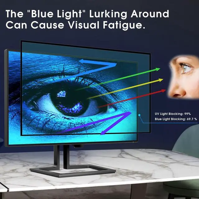 2 Pack Removable Monitor Blue Light Filter include2 Pack Removable 27 Inch Blue Light Screen Filter for Computer 16:9 Frameless Monitor, one for office, and the other one for home, eye Protection everyday; ^^ 69.7 % Blue Light Blocking Filter for 27 Inch 16:9 Frameless Monitor- FILMEXT 2 Pack blue light screen Protector 27 inch Monitor 16:9 take self-developed upgraded composite materials, 69.7 % blue light blocking filter blocks the harmful blue light between 380nm~490nm from the wave range of visible lights, blue light reaches the retina with strong energy. This filter reduces digital eye strain when viewing screens and gives you a better sleeping.