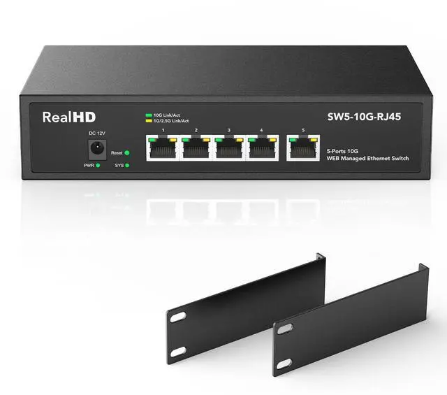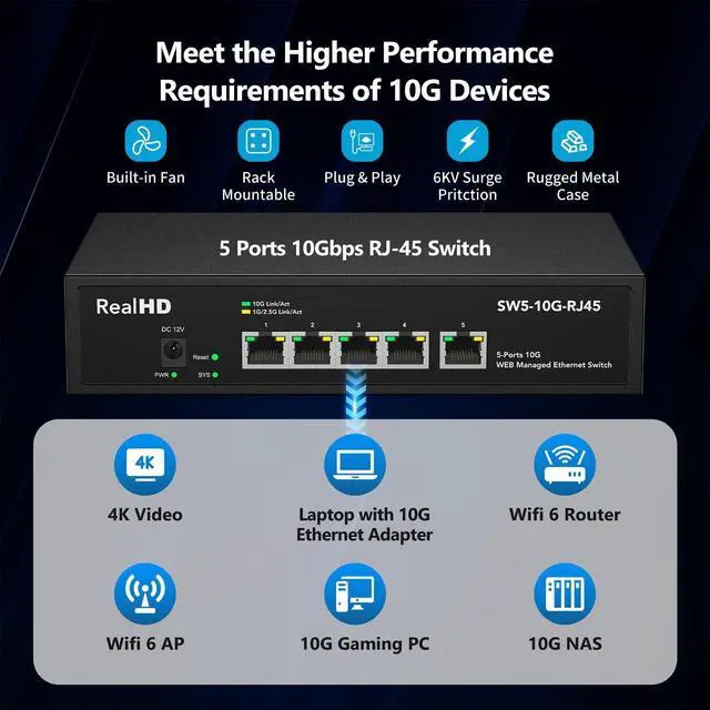 [ 10G Super-Fast & Multi-Gigabit ] This 10 gigabit switch features 5 x 10G RJ45 ports with 100Gbps switching capacity, providing higher-speed connectivity for your devices and allowing you to easily upgrade your network to support the latest 10G ethernet standard. Also compatible with 5G/ 2.5G / 1000M/ 100M devices and speed auto-negotiation with LED indicator.
