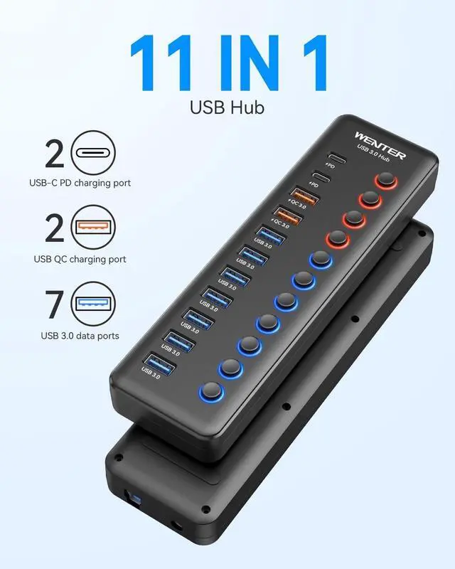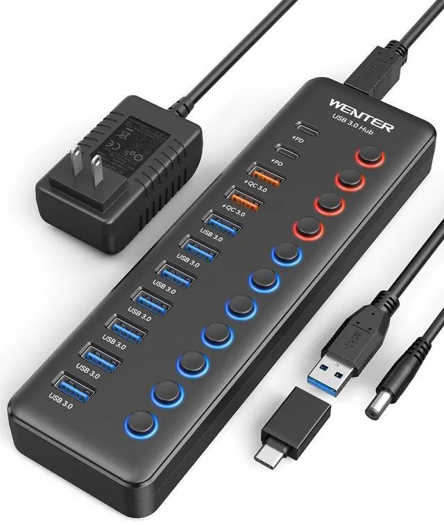 Charging Port: Wenter Powered USB hub offers additional 2pcs A Port and 2pcs type-C charging dedicated port, so you can charge your tablets, cameras, phones, watch, and Bluetooth Headset without having to find extra wall outlet space. With the 12V/ 4A power adapter, The USB hub can support PD 3.0 and QC 3.0.