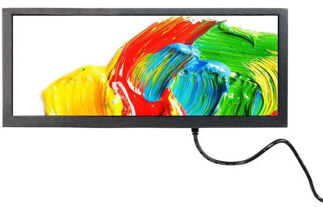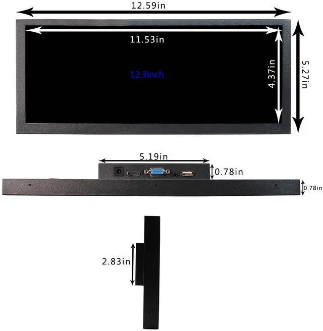 Bar Style LCD 12.3 '' 1920X720 stretched bar display, portable ips LCD monitor with dual speakers, /USB/VGA video port input ^^ IPS Screen Panel178 degree full view angle with good color showing effect, the picture is crisp and vivid ^^ Multiple InterfacesSupport multiple signal interfaces input /USB/VGA for LCD display monitor, it's convenient to connect pc/compter/laptop/gaming monitor/security camera devices ^^ Easy to Use (A) 12.3 inch LCD monitor comes with brackets, it can be install with brackets. (B) And there is 75mm mounting holes on the back of monitor, which is also easy to install with desk stand mount ^^ MultipurposeSmall, extra-wide monitor, as a seondary display monitoring for pc/laptop, in car or advertising screen monitor etc.
