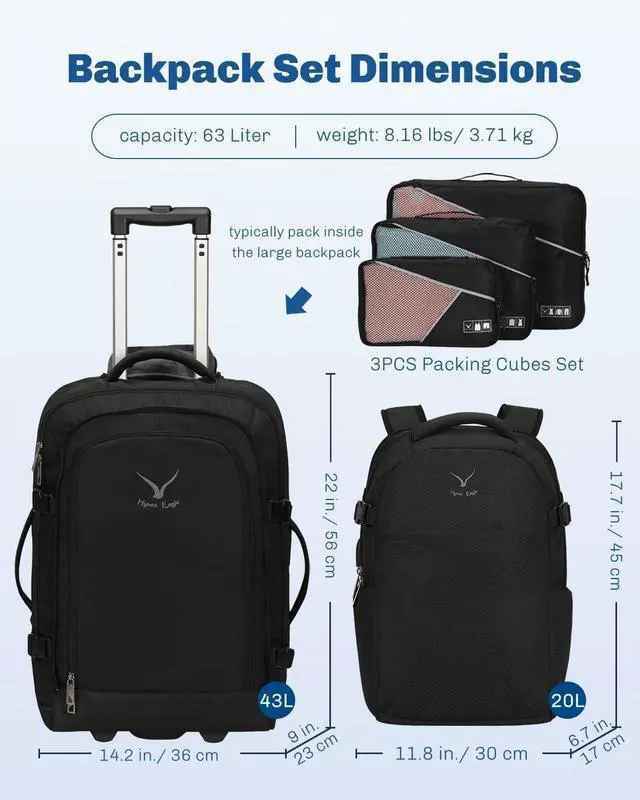 Detachable Daypack: 17.7 x 11.8 x 6.7 in. (45 x 30 x 17 cm), easily fits under the seat, also can slide over rolling luggage handle when on the go, adjustable sternum strap brings extra carry comfort; fits up to 15.6 in. laptop and 10.5 in. tablet, interior mesh zip pocket is easy to organize last minutes accessories, from passport to wallet. travel backpack features a USB-A charging port and a headphone jack (not including power bank), convenient to charge your phone and enjoy music anytime. ^^ 43L Convertible Carry on Rolling Backpack, measuring with 22 x 9 x 14.2 in. (56 x 36 x 23 cm), features spacious main compartment with zip mesh pocket for travel supplies, makes it easy to hide away the shoulder straps when use as luggage, if you want to carry rolling backpack on your back, the back compartment provides a protective padded for comfort, the wheels will not hurt your back, it is also built with adjustable sternum strap.