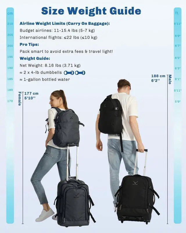 Luggage: Fits within IATA carry-on size guidelines for most airlines, American Airlines, EasyJet, Frontier Airlines, Spirit Airlines, United Airlines etc. Large rolling backpack can be used as carry on bag. Smaller casual daypack fits as your personal item. it's ideal for weekend out, staycation, overnight trip, domestic trip, international tour, cruise etc.