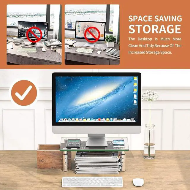 EFFECTIVE HEAT DISSIPATION: The monitor riser is made of tempered glass and stainless steel legs to make your desktop clean and tidy ^^
