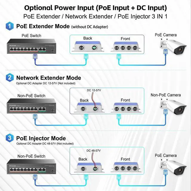 5 Gigabit PoE Ports: Include 1 PoE In, 4 PoE Out, 10/100/1000Mbps speed. 100BASE-TX, Cat5 or later UTP(150 meter); 1000BASE-TX: Cat6 or later UTP(100 meter)