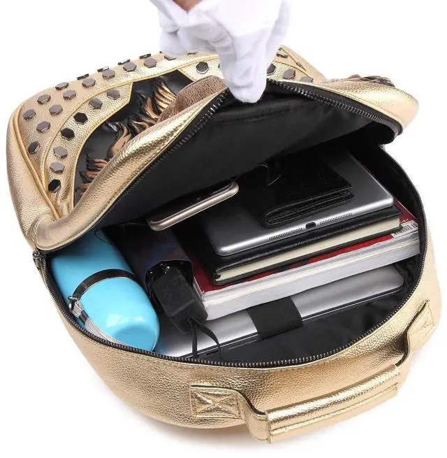 size: 19.7 * 11.8 *5inch. The handbag is decorated with 3D metal rivets and 3D embossed lions come to life, making it more stylish and personalized, youre sure to be attractive and outstanding as you carry it out on the way the traveling. It has a laptop padded sleeve and two small openings that can store stuff like the card, mobile phone, keys, etc. This shoulder backpack is suitable for men or women, THIS ITEM IS NOT INTENDED FOR USE BY CHILDREN 12 AND UNDER. who need a high capacity daypack to travel, sports time even workplace