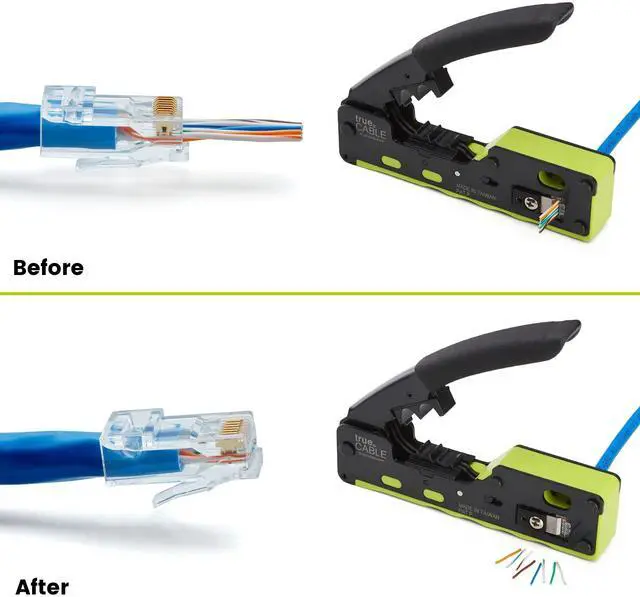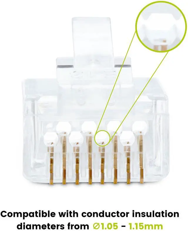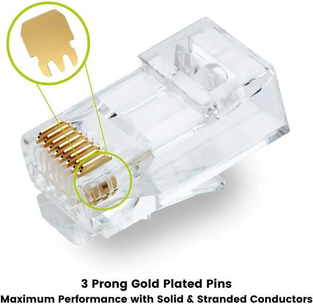 [Pass Through Design] No more load bars means less waste and frustration. The ability to see the conductors come through the front of the plug allows you to verify the correct TIA 568A or 568B color sequence which minimizes bad terminations. ^^ [Maximum Performance] Staggered conductor design minimizes NEXT/FEXT. Ensuring the best cable to plug combination, pass through plugs allow a push-pull method to seat the cable jacket as far into the plug as possible. Triple prong gold plated contacts.