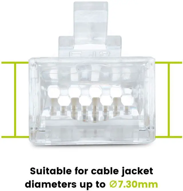 Supports Power over Ethernet: PoE/PoE+/PoE++ (IEEE 802.3 af/at/bt) 4PPoE up to 100W. ^^ [Versatile] Works with 23AWG stranded or solid conductors. Suitable for cable jacket diameters up to 7.30 mm and conductor insulation diameters from 1.05 - 1.15 mm. Terminate with our All in One Crimp and Termination Tool. ^^ [Premium Quality] ANSI/TIA 568 2. D Certified and Validated with trueCABLE U/UTP Ethernet cable. ETL, UL, SGS (RoHS REACH / SVHC) Verified and Tested. FCC compliant. ^^ [Resealable Bag] These transparent gold plated RJ45 plugs are sure to make your install hassle free.