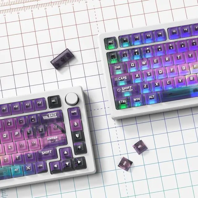 Transparent Frosted keycapsHd light transmission features, minimalist style, enhance the beauty of mechanical keyboard, so that your keyboard looks high-end atmosphere. ^^ Durable and long-lasting materialMade of advanced PC material, these keycaps are resistant to friction, wear and tear, ensuring a long-lasting and comfortable gaming experience. ^^ MDA Profile KeycapsMDA keycaps have a slightly rounded shape, which visually will make your keyboard look more adorable, and at the same time the contact area between your fingers and the keycaps is larger, with a flatter surface that is less likely to be accidentally touched, making it perfect for typing.