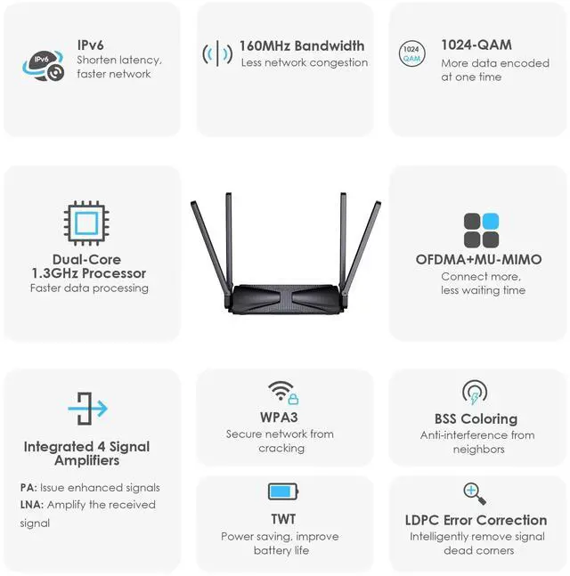 Dual-Band WiFi 6 Mesh RouterThe WAVLINK AX3000 Wi-Fi 6 Wireless Router features dual-band signals with 5G transfer rate of 2400Mbps and 2.4G transfer rate of 600Mbps, reducing buffering and latency for smooth roaming. ^^ Gigabit Ethernet RouterEquipped with 1 Gigabit WAN port and 2 Gigabit LAN ports, this router provides stable and fast wired network access. Advanced 1.3GH z dual-core processor for powerful processing power and more stable operation. ^^ 3, 000 sq. ft. CoverageThe combination of four high-gain external antennas and beamforming technology extends powerful, reliable Wi-Fi throughout the home, covering up to 3, 000 square feet.