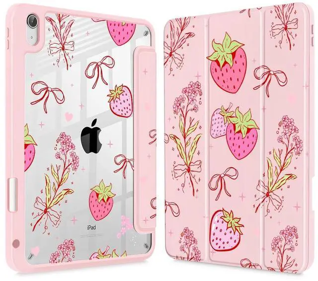 May Chen for iPad (A16) 11th Generation Case 11 Inch 2025, iPad 10th Gen Case 2022 10.9 inch, Built-in Pencil Holder with Shockproof Cover Clear Transparent Back Shell Auto Wake/Sleep, Strawberry Bow