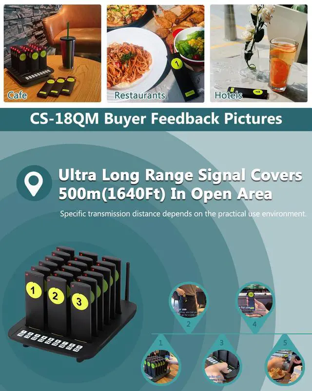 LONG RANGE: Each set of restaurant pager system is independently coded, stable signal, multiple simultaneous use without messy code, no interference. The theoretical range of the pager is greater than 2000 feet. The actual operating range depends on the environment ^^