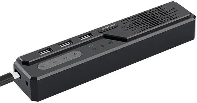 • 3-in-1 USB Computer Speaker with MicrophoneCombine speaker, microphone, usb hub, audio port, and control buttons in one.This USB computer speaker has a built-in high-performance microphone.Conduct professional conferences with our speaker phone. It has everything you'll need to sound good.This soundbar features a 3-port USB hub that can be connected to devices with USB output.The extended 1.8m cable allows for perfect setup and easy access to out-of-the-way ports.