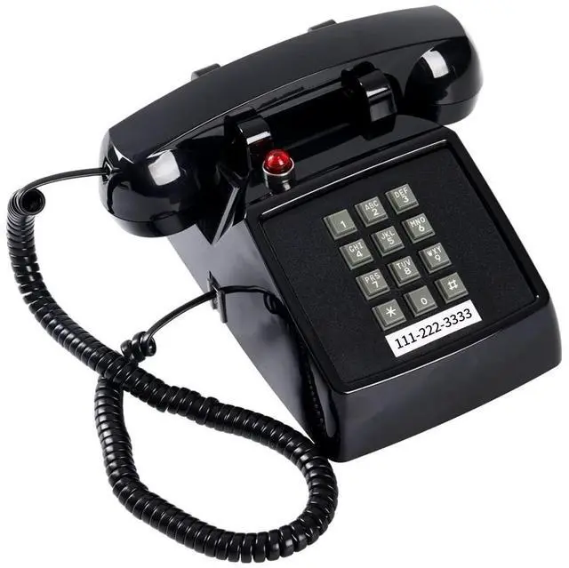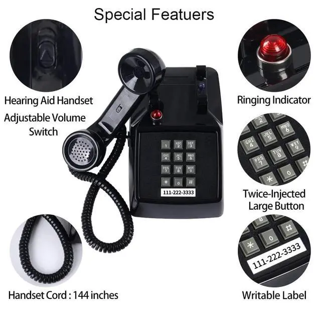 Classic Design, High Quality This tranditional black vintage desk telephone for landline has been popular from 19080s is built by Metal base and ABS materials, with Twice Injected large buttons, makes it well operate in most demanding environment and keeps working for long time in school, home, hotel and popular from 1980s. ^^ Powerful Features, Easy InstallationThe old school 2500 desk phone works Without External Power, just need plug the telephone line into LINE port. Long handset cord (144 inches) and Long extension line (180 inches) together with Perfect Weight, it can well fit any table.