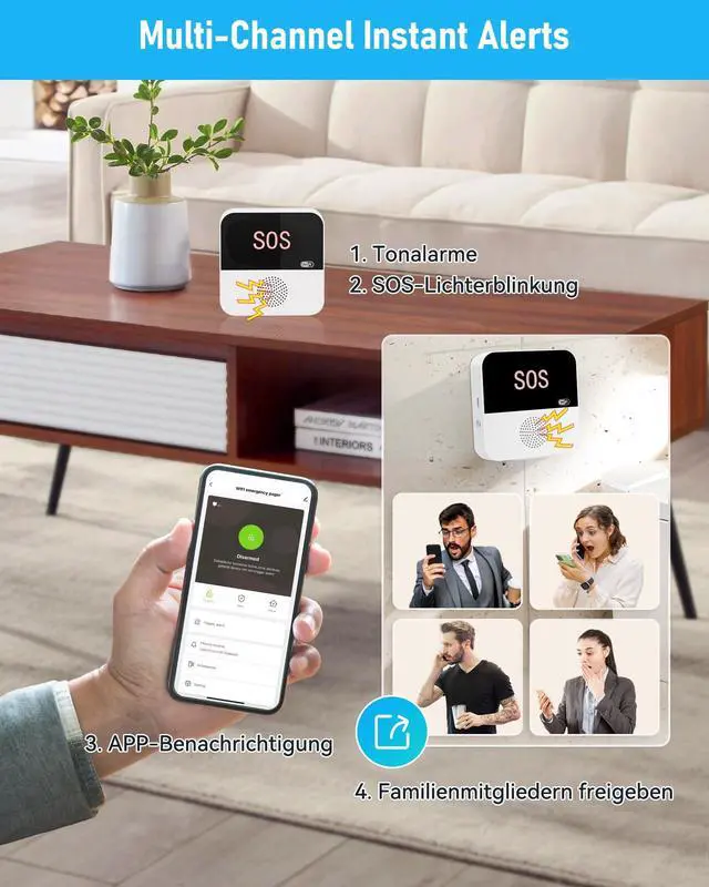 Multi-Channel Instant Alerts: Press any panic button to trigger a loud alarm with flashing lights and instantly receive an app notification on your phone. Share notifications with family via the app;