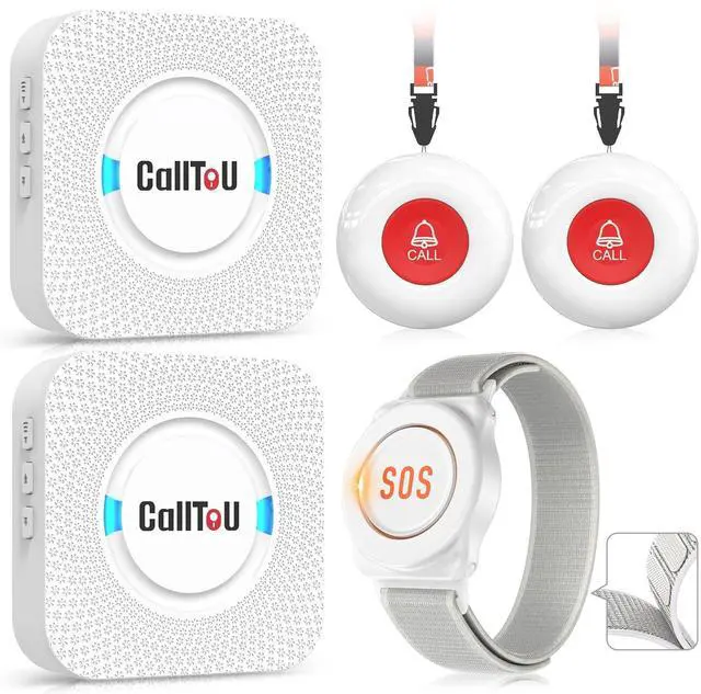 [ Wireless Guard ] 2 Receivers 2 Call Button 1 Watch Transmitter. Allow caregivers and residents to be free while ensuring that help is still available at the touch of a button, ideal for elderly, seniors, patients, disabled ^^ [ Easy to Carry ] The receiver can be moved with the caregiver and the open area working range is 500+ ft, you can take it to the bedroom, kitchen or living area (receiver requires plugging into an outlet). The call button can also be hung around the neck of the person with a neck strap who needs help like a pendant or secured with a bracket or double sticker ^^ [ Smart Ringtones ] The receiver of caregiver pager has 55 ringing tones to choose from and 5 level adjustable volume from 0db to 110db.