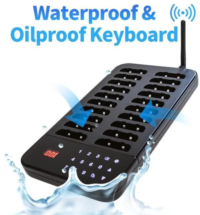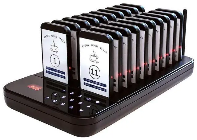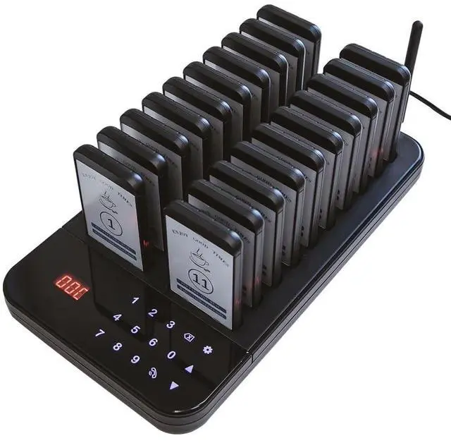 OUTSTANDING PERFORMANCE- The restaurant pagers system consists of one 998 channel wireless touch keypad transmitter and 20pcs pagers. Customers don't have to wait in line, keep social distance, and improve work efficiency. Keyboard can beep and shake when pressed. ^^ 7 PROMPT MODES- Shake+flash+buzz, shake+flash, flash+buzz, shake+buzz, shake only, buzz only and flash only. Widely used in restaurants, hotels, hospitals, churches and cafes. ^^ DIGITAL CONTROL & DISPLAY- Equiped with a large LCD screen display for easy operation and precise control. With a logo display area in front, you can place your store image, name, or other advertisements.