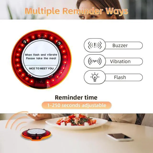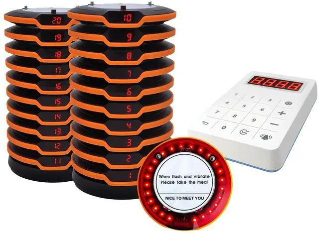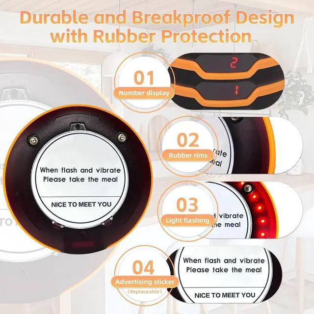 Easy To Use and SetupThe wireless calling system is of simple, compact design, conveniently portable and easy to operate, the only requirement being a mains power supply. Pre-Paired for Instant Use Zero Setup Required ^^ Ultra-Durable Restaurant BuzzerEach pager features a durable and breakproof design with rubber protection that absorbs impacts, preventing damage from drops, collisions, or daily wear-and-tear in fast-paced kitchens and dining areas ^^ Adjustable Notification ModeRestaurant Pager System with dual alert modes (Vibration+Buzzer+Flash or Vibration+Flash) and adjustable alert duration (1-250 Seconds), providing unmatched flexibility to match your business operations ^^ Rechargeable Coaster BeepersThis pagers for restaurants have a built-in rechargeable battery for long-lasting use.