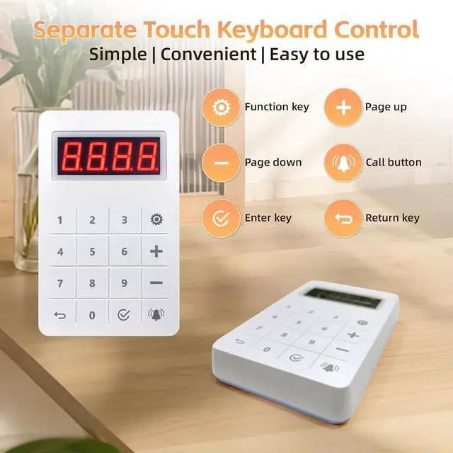 Comes with 20 Buzzers & Dual Charging Bases, each dock charges 10 buzzers, ensuring all devices stay ready during peak hours ^^ Full Touch Keypadour restaurant paging system features a separate wireless call pad, giving you more placement flexibilityon the counter, wall, or handheld ^^ Versatile UseThe restaurant pager has a range of about 300 feet indoors and 1, 000 feet outdoors. Ideal for a wide range of applications, including restaurants, food trucks, coffee shops, clinics, and churches