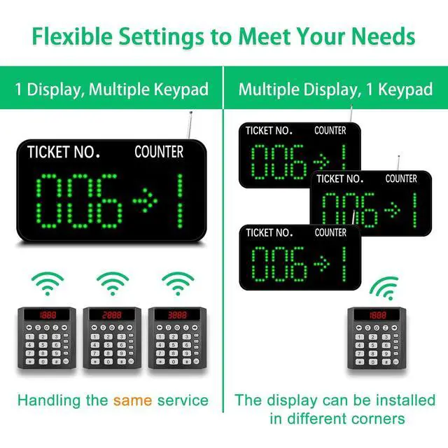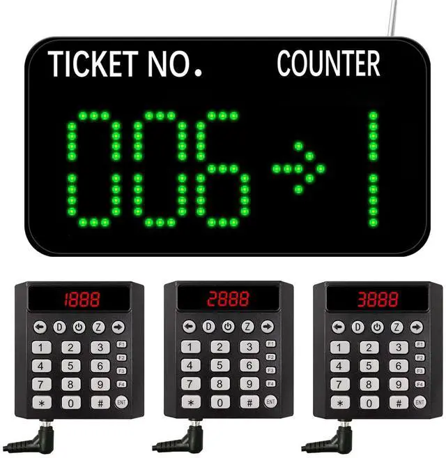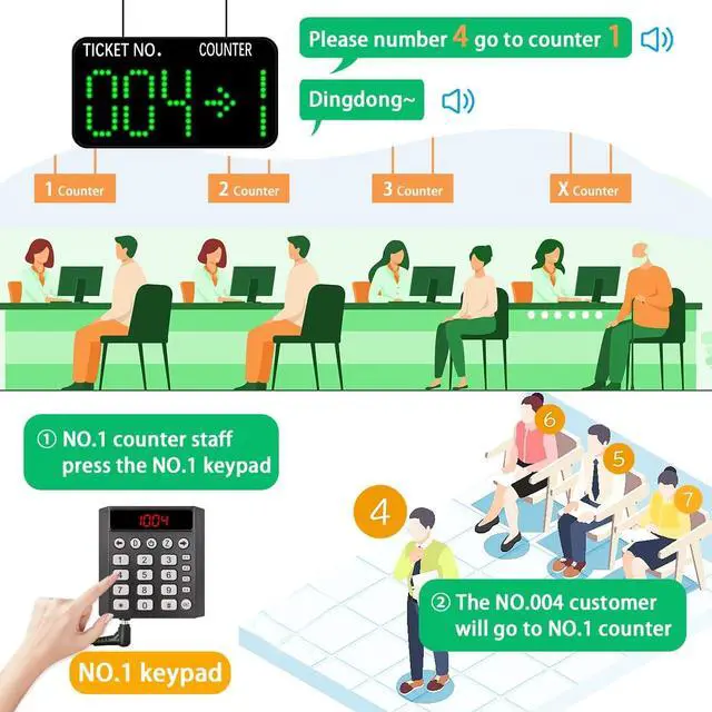 How It Works Hand the customer a 3-digit numbered ticket. When you are ready to serve the next customer, press the number you wish to call. The number will appear on the screen with a voice prompt. Customers can easily know which counter or window they should proceed to.
