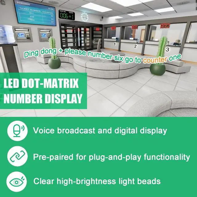 Multi-Function Number Display The led display can be mounted on a wall or desktop. Its voice mode, volume and number of prompts can be adjusted. The default voice is "please number XXX go to counter X", you can choose a voice reminder with only a ding-dong sound (no number is broadcast)
