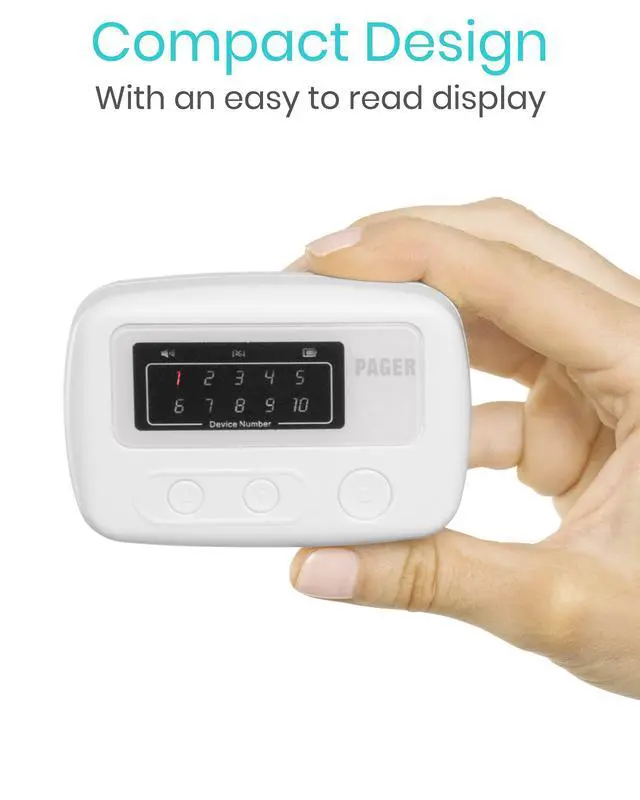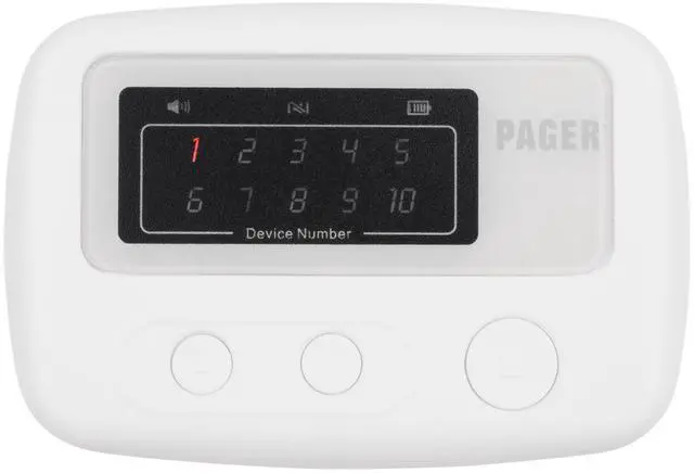 ^^ THREE NOTIFICATION SETTINGS: The versatile pager features three notification settings with an adjustable volume level. Settings include an audible chime, a silent vibration or a combination of audible chime and vibration. Alerts are also displayed on the large screen in addition to a battery and volume indicator. Quickly and easily silence alarms with the oversized stop button located on the front of the pager.