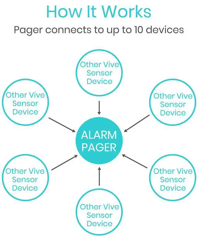 CONNECT UP TO TEN DEVICES: Programmable to a maximum of ten wireless devices, the pager is compatible with all Vive Health alarms, including the bed, chair and floor sensor pads, the call button, and door and window alarms. Each device is assigned an alarm number which will be displayed on the receiver screen for easily locating those who need assistance.