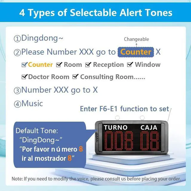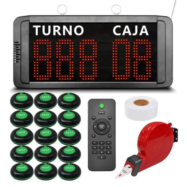 The default language for this queue management system is Spanish. Please confirm before placing your order. The next number ready to be served is displayed and broadcast in real time, so customers know which number is now on their turn and can estimate how long they may have to wait. Now serving system is a practical and efficient option