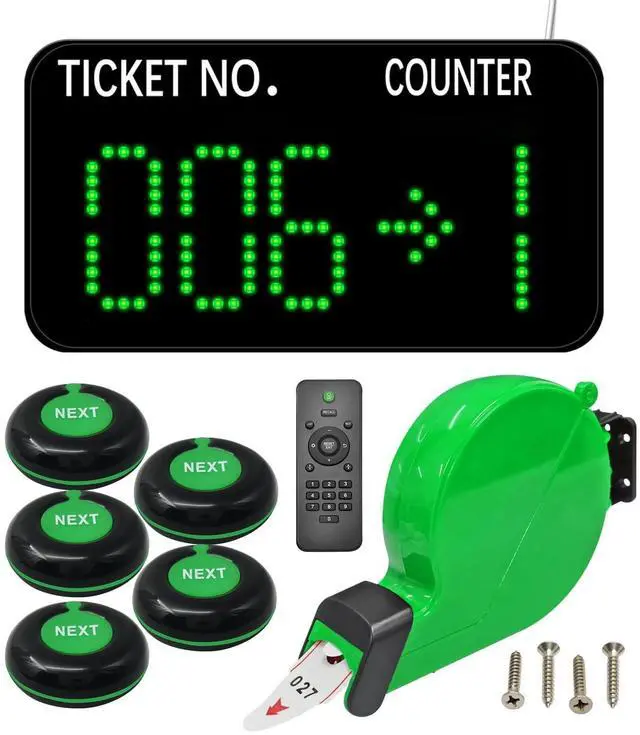 KOQICALL Take a Number Machine Queue Wireless Calling System for Customers with 1 Dot-Matrix Display Show Ticket and Counter Number 5 Waterproof Next Call Button 1 Green Ticket Dispenser