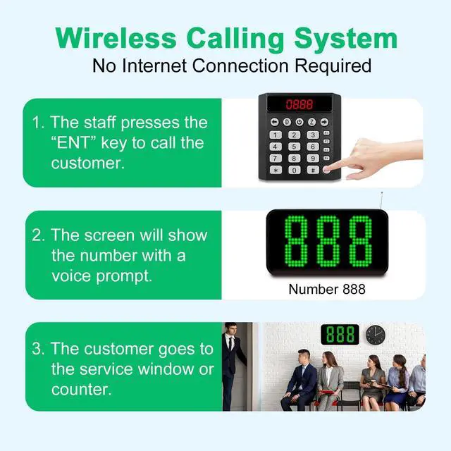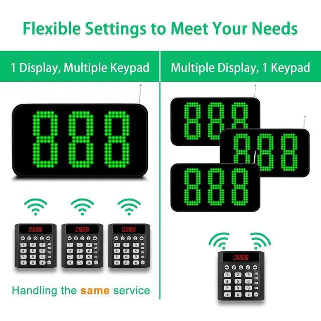 How It Works Press the corresponding number key to call the customer when it's their turn. The screen will show and broadcast the number, the customer will then go to the service window. A single keypad can simultaneously call multiple displays, while multiple keypads can also call a single display.