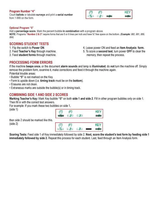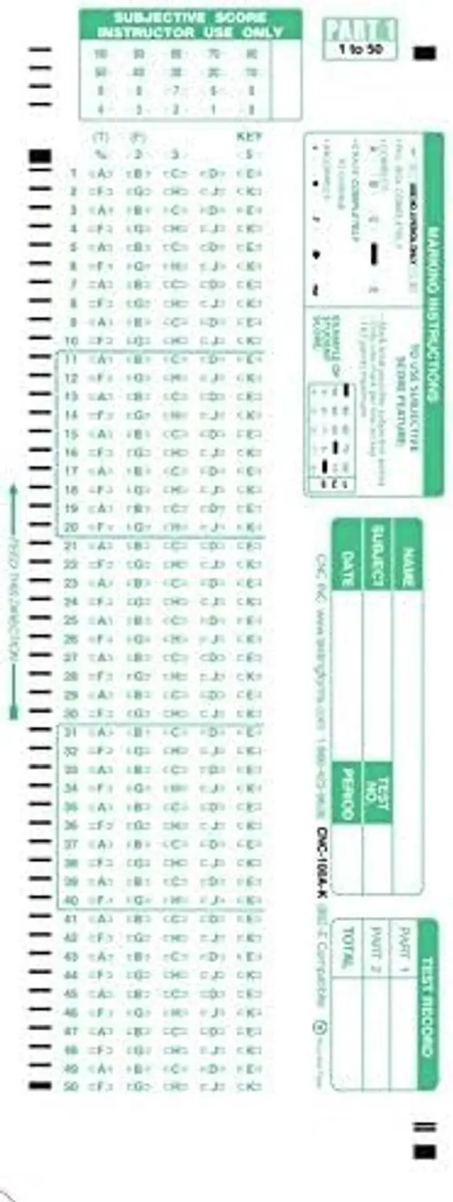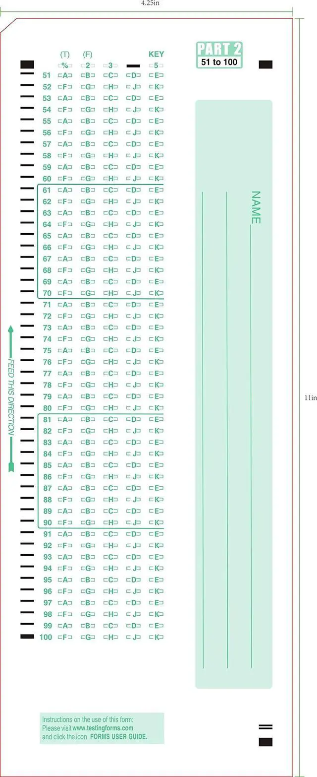 Dimensions: 4.25" x11" Visual Alignment notch allows for easy alignment of many papers at once. There are 100 alternating multiple choice A-E or T/F questions on each side. Responses Alternating A, B, C, D, E & F G H J K 1-50 on the front, 51-100 on the back. These are 100% compatible. Can also serve as a master key with answers 888P 888P+ Item Analysis Form 9700 Compatible