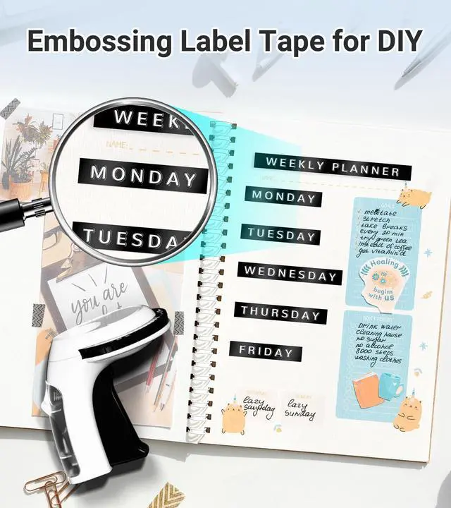 : The embossed label maker manual features an easy-to-use rotating and clicking system. Users simply turn to select characters and press a button to create labels. This user-friendly design is suitable for both adults and children