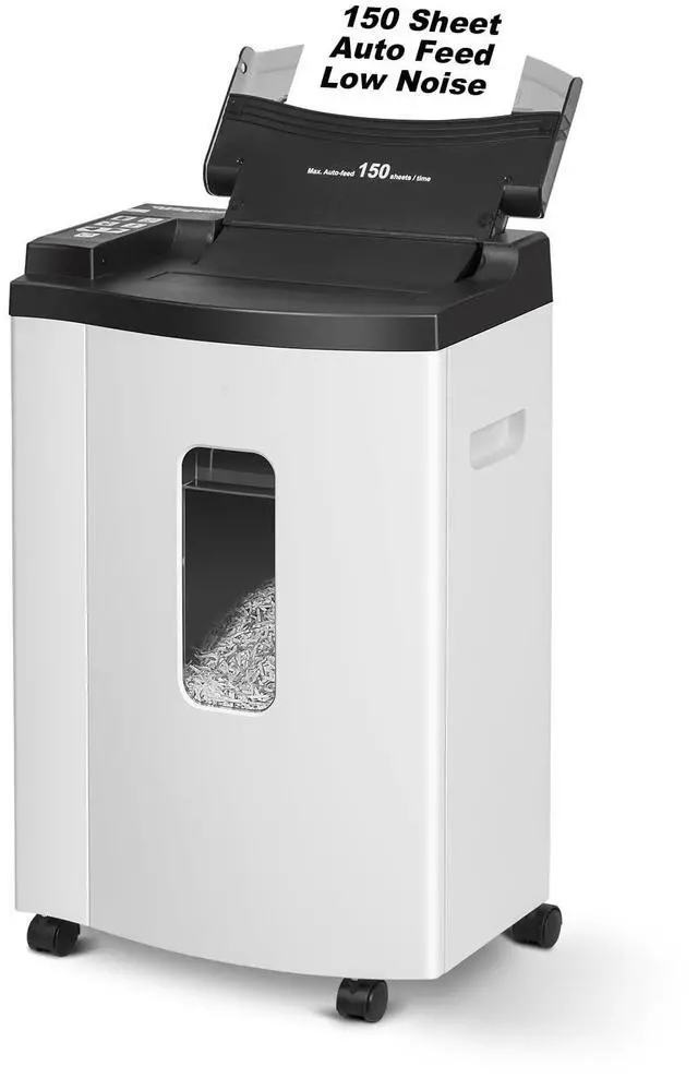 Auto-Feed 150 SheetsEffortlessly shred up to 150 sheets automatically with hands-free operationperfect for bulk document disposal. Simply load the stack and let the machine do the work, saving time and effort. ^^ P5 High-Security ShreddingProtect sensitive data with P5-level security, reducing documents to confetti-sized 2x15mm particles (5/64" x 19/32")virtually unreadable and compliant with strict privacy standards. ^^ Whisper-Quiet 55dB OperationEnjoy library-level quietness (55dB) for distraction-free shredding in offices, home offices, or shared spaces. ^^ High-Capacity 23L BinThe spacious 6.1 -gallon bin holds up to 400 shredded A4 sheets, minimizing interruptions for emptying during large tasks.