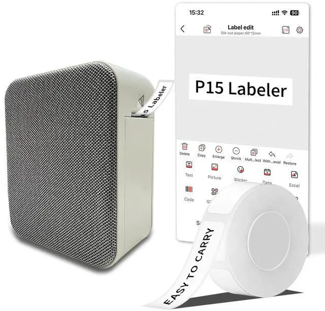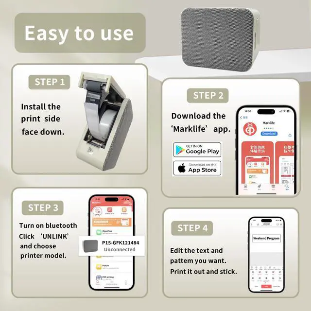 • Easy TO UseP15 Bluetooth label printer supports iOS & Android. Mini Bluetooth wireless thermal label printer, connect to your smart phone in 2 seconds via Bluetooth 4.0. The free App is downloaded from APP STORE or Google Play.