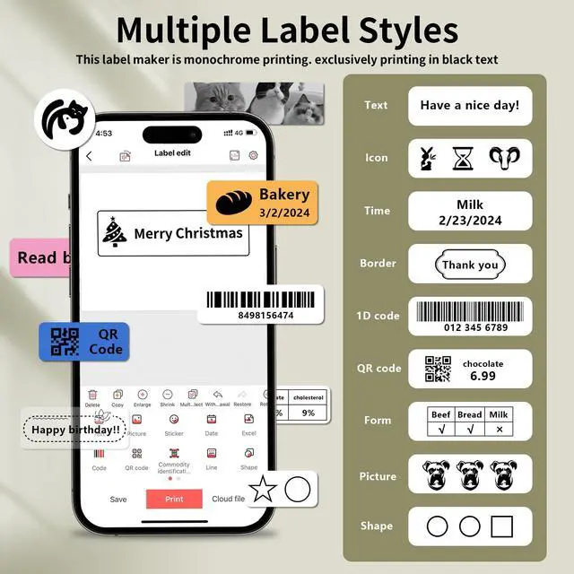 • Multifunctional APPWireless label printer also supports bar-code, qr code, picture, scan code, text, Excel import, smart OCR scanner, massive vivid icons, easily create your own customized labels, preview and save record, improving efficiency.It can be Large-capacity continuous printing.