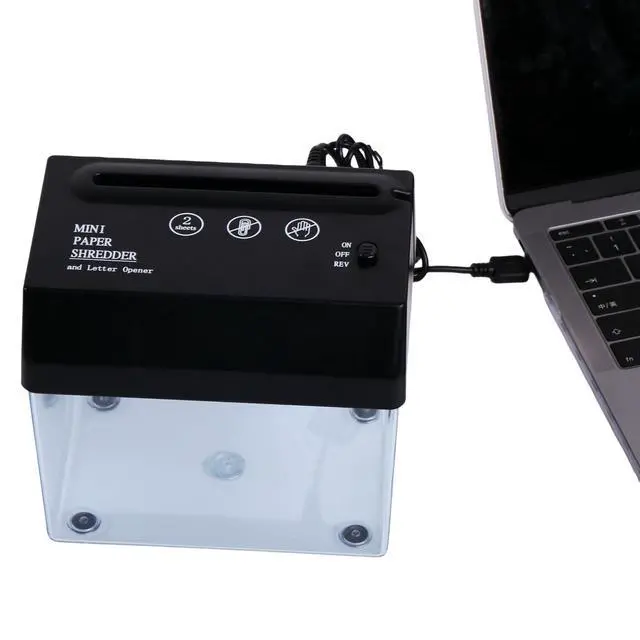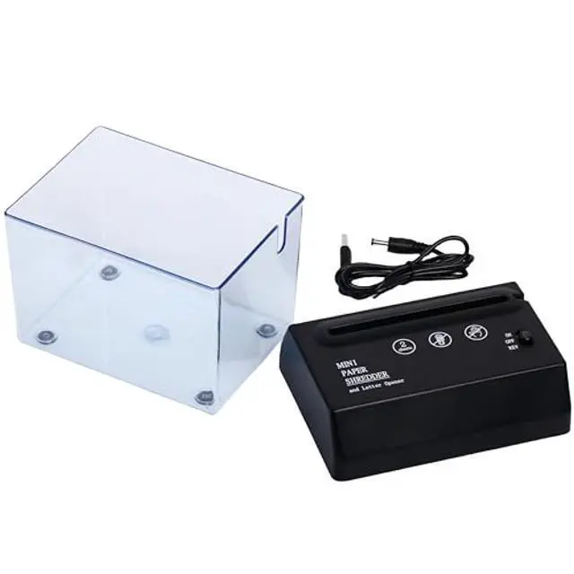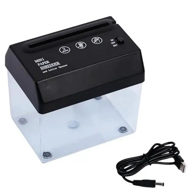 Auto Black ShredderMini and portable design, easy to carry around. The paper shredder with a wastebasket keeps your desk clean. With a 123mm width entry slot for shredding paper, A6 or folded A4 size. The shredder with letter opener can help you tear the envelope easily. 3-position ON/OFF/REV (reverse) slide switch to control the shredder, easy to use. Powered by 4 * AA batteries or USB cable, convenient to use. (Batteries are not included) After cutting, the strip width is 3.5 mm, it is good to protect your information and privacy.