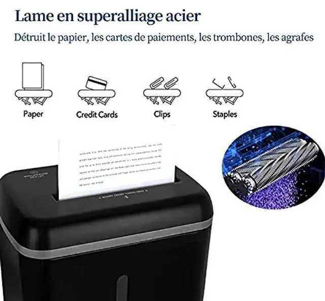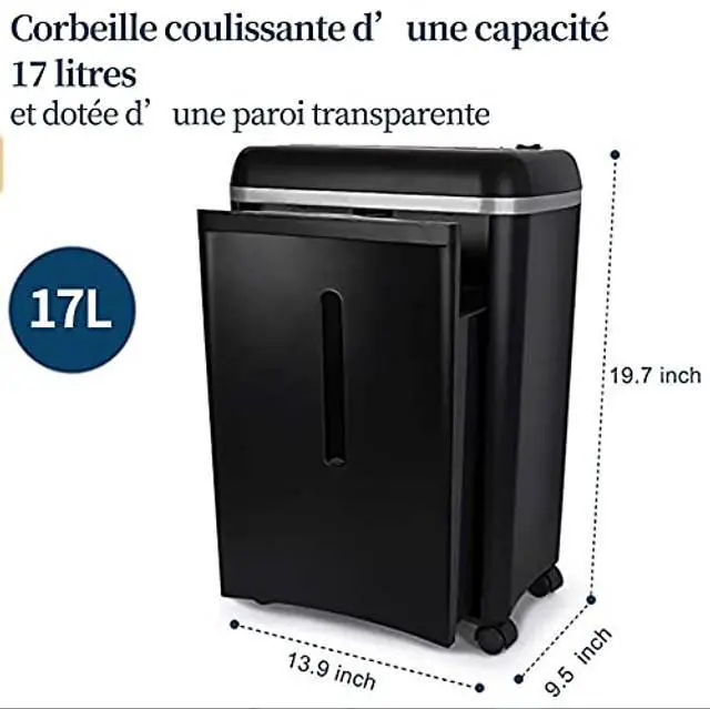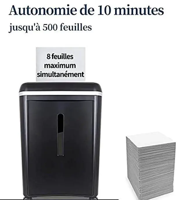 SUPER MICRO CUT HIGH SECURITY LEVEL P-5 paper shredder to secure confidential information. Shreds max 8-sheet paper/staples/clips/credit cards into tiny particles measuring 3/32" x 15/32" (2x12mm) ^^ 10 MINUTES CONTINOUS WORKING TIME shreds upto 500 sheets per working cycle ^^ SUPER ALLOY STEEL CUTTER shreds through paper, staples, credit cards and junk mails at ease ^^ LOW NOISE LEVEL 54dB ultra-quiet performance; 4.5 gallons pull-out waste bin with easy viewing transparent window ^^ DUAL THERMAL PROTECTOR to keep sustainable using and prolong shredder's lifetime. Grounding plug can protect people from electric shock