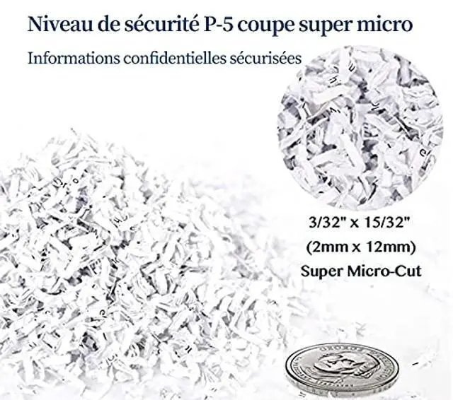 • SUPER MICRO CUT HIGH SECURITY LEVEL P-5 paper shredder to secure confidential information. Shreds max 8-sheet paper/staples/clips/credit cards into tiny particles measuring 3/32" x 15/32" (2x12mm)