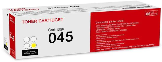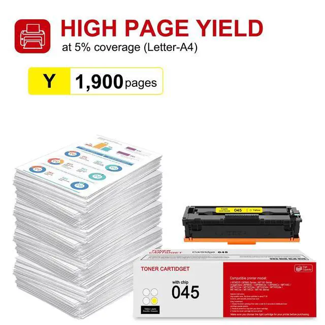 ^^ Page Yield: 1, 900 pages per CRG-045 Y Yellow toner cartridge at 5% coverage. ^^ Highly purified toner assures the long-lasting character of the cartridge which allows it to produce more pages comparing to similar products. ^^ Please make sure your printer series before buying. If you have any issues please find us immediately., we always being with you and provide satisfied answers.