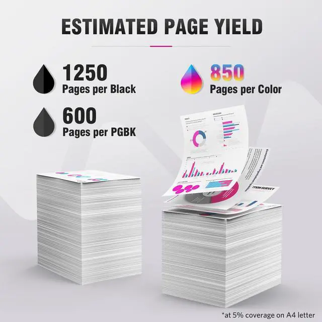 Page Yield: PGBK (Large Black) is 600 pages per cartridge, Photo Black is 1250 pages per cartridge, and 231 Color cartridge is 850 pages per cartridge at 5% coverage ^^ Excellent ink quality will not clog the print head, print clear and bright picture smoothly