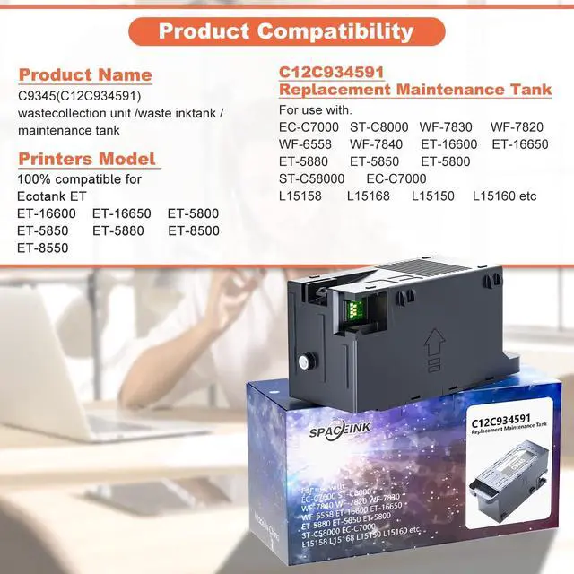 • Compatible Printers: The C9345 Ink Maintenance Box works with ET-8550 ET-8500 ET-5800 ET-5850 ET-16600 ET-16150 ET-16650 ET-18100, WorkForce Pro ET-5880 ET-16680 ET-M16600 ET-M16680 WF-7840 WF-7835 WF-7830 WF -7820 WF-7310 WF-M4119 WF-M4619 EC-C7000 ST-C5000 ST-C5500 ST-C8000 ST-C8090 wait.