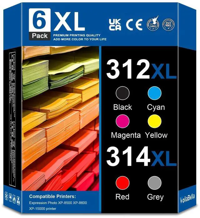 What you will get: 6 Pack 312XL 314XL Ink Cartridge (1BK/1C/1M/1Y/1G/1R)Suitable for the following printers: Expression Photo XP-8500 XP-8600 XP-15000Good Ink Cartridges should be like this: Increased efficiency-Improved technology and Ink help you meet your printing needs efficiently. Print in no time at all. Excellent quality-Professional quality management strives to ensure excellent quality and keep your prints free of lines, spots and penetration. Secure packaging-Sealed packaging. Multiple protection. Avoid damage during shipping. Better Print WithProducts from are manufactured by high quality materials with minimal resource loss from the factory. VoilaBella Provide quality after-sales service, so that you have no worries. We are committed to providing you with a pleasant printing!
