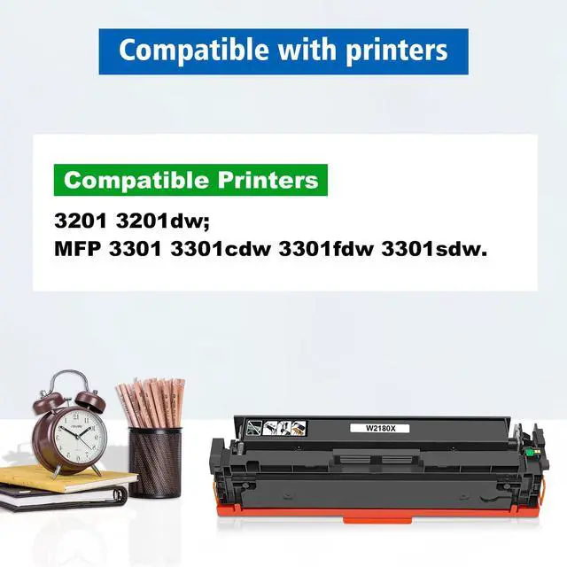 Package Contents -- Include 1 pack 218X W2180X black toner cartridge already installed with chips, deliver a smooth, efficient printing experience every time. ^^ Printer Compatibility -- Compatible with 3201 3201dw MFP 3301 3301cdw 3301fdw 3301sdw series Printers. ^^ High Page Yields -- High capacity up to 3, 200 pages per black toner cartridge (at 5% coverage on A4 paper, based on ISO/IEC 19752). ^^ Superior Print Quality -- Our refined toner powder and high-quality cartridges work together to deliver accurate, vibrant colors, sharp blacks, and crisp graphics for professional-grade results every time.