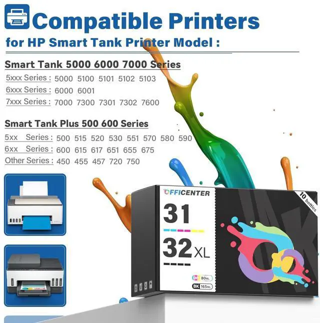 Compatible Printers: 31 32XL ink bottle set compatible replacement for hp smart tank 5101 7301 6001 7602 5000 7001 5103 5102 757 7601 755 6002 7302 plus 651 551 455 457 450 ink refill ^^ 31 32xl ink