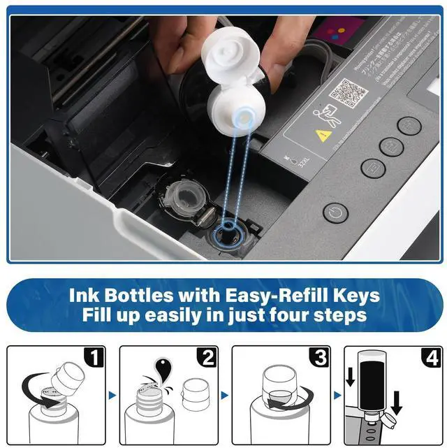 Automatic bottle stop: Smart tank ink adopts automatic bottle stop design, no overflow, easy to fill, just press once ^^ 10 Bottles Large