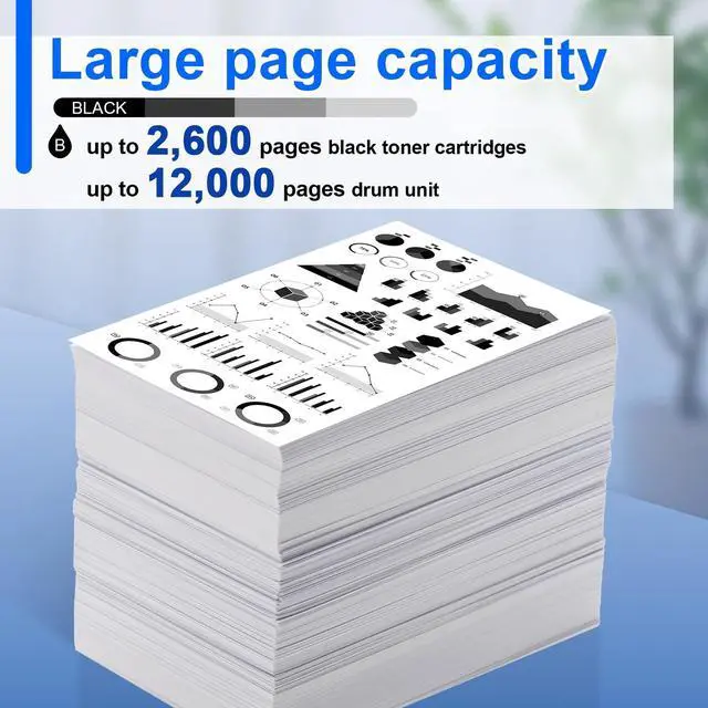 • Page Yield: 2,600 pages per toner cartridge and 12,000 pages per drum unit (at 5% coverage Letter A4). High and Consistent Printing Yields with excellent production processes whether you're printing documents brochures or invoices.