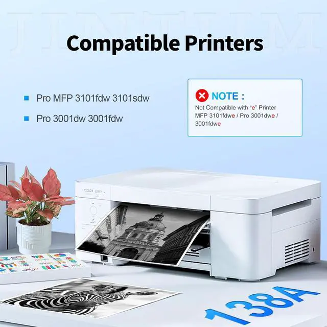 Warning: This 138a toner cartridge can only be used in MFP 3101fdw 3101sdw / Pro 3001dw 3001fdw printers and is not compatible with printers with an "e", for