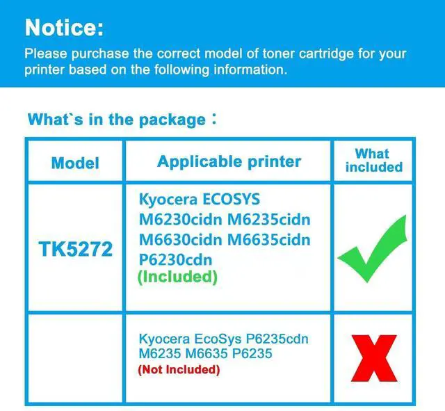 Reliable Quality: LCL TK5272 cartridge uses high quality toner, toner particle size distribution, good mobility, high transfer rate, resulting in a clear image and high gloss print effect; Printing efficiency is high, waste powder rate is low, so as to ensure sufficient page yield.