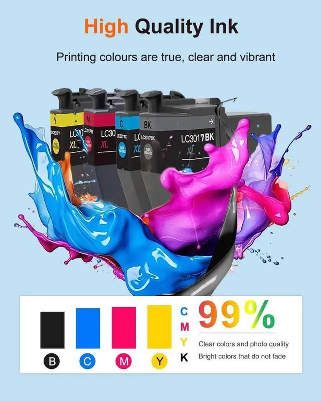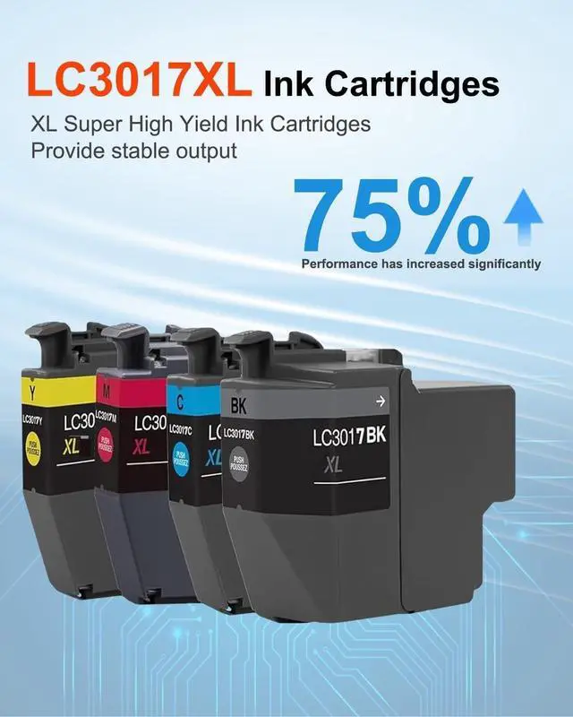 Upgrade of smart chips: The upgraded LC3017XL Ink Cartridges perfectly achieved 100% compatibility, performance, print quality and higher page yield ^^ Quality cartridges provide colorful, vivid prints. Printing is clear, smooth, easy to fill, and does not clog the print head, resulting in an efficient process for daily printing in the office and home ^^