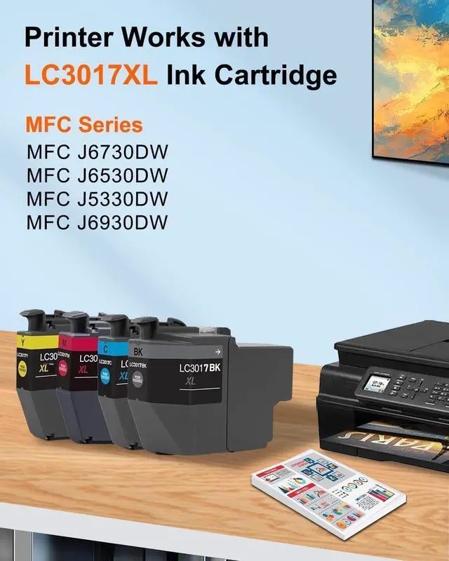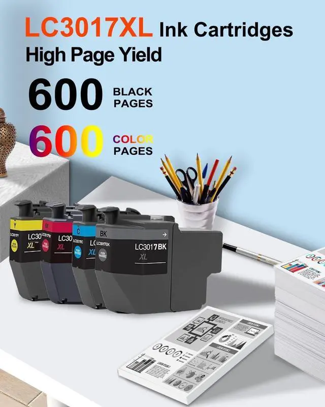Page Yield: up to 600 pages per lc3017 black cartridge, up to 600 pages per lc3017 color ink cartridge ^^ Compatible LC3017 XL Ink Cartridge PrinterMFC-J5330DW MFC-J6530DW MFC-J6730DW MFC-J6930DW Printer ^^